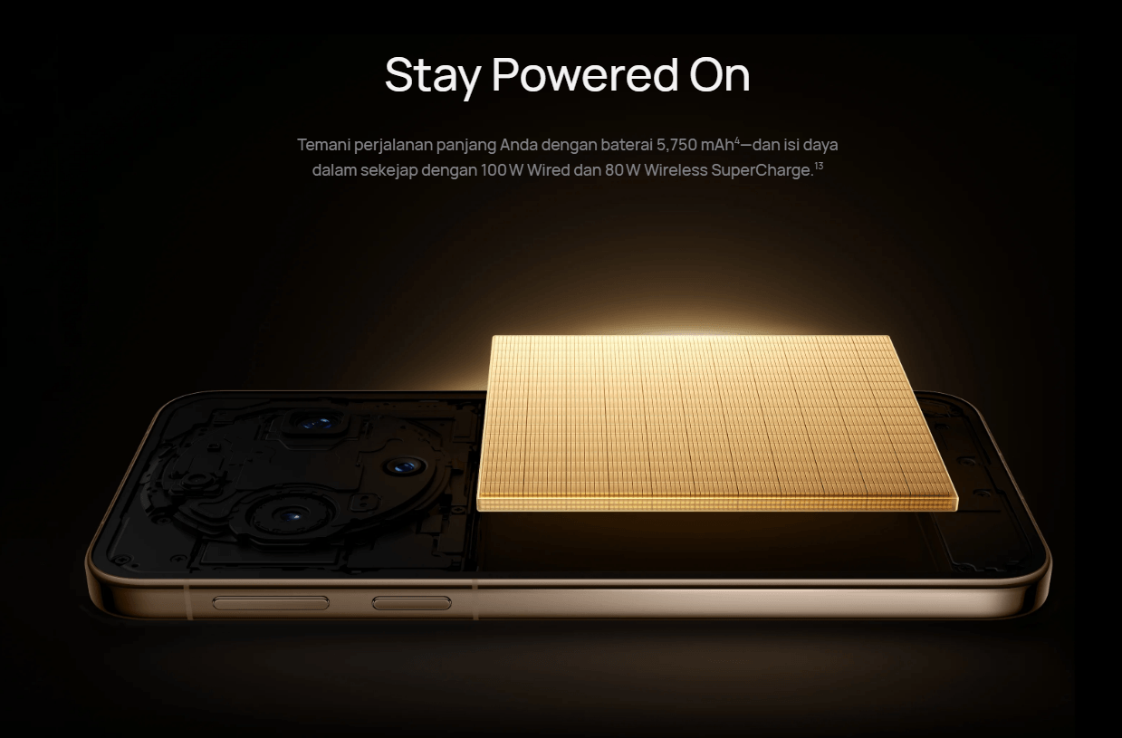 Tak bisa dipungkiri bahwa daya tahan baterai adalah salah satu faktor utama yang dipertimbangkan pengguna saat membeli smartphone. HUAWEI Mate 80 Pro hadir dengan baterai besar berkapasitas 5750 mAh (kapasitas tipikal) yang mampu menemani aktivitas Anda sepanjang hari tanpa masalah.