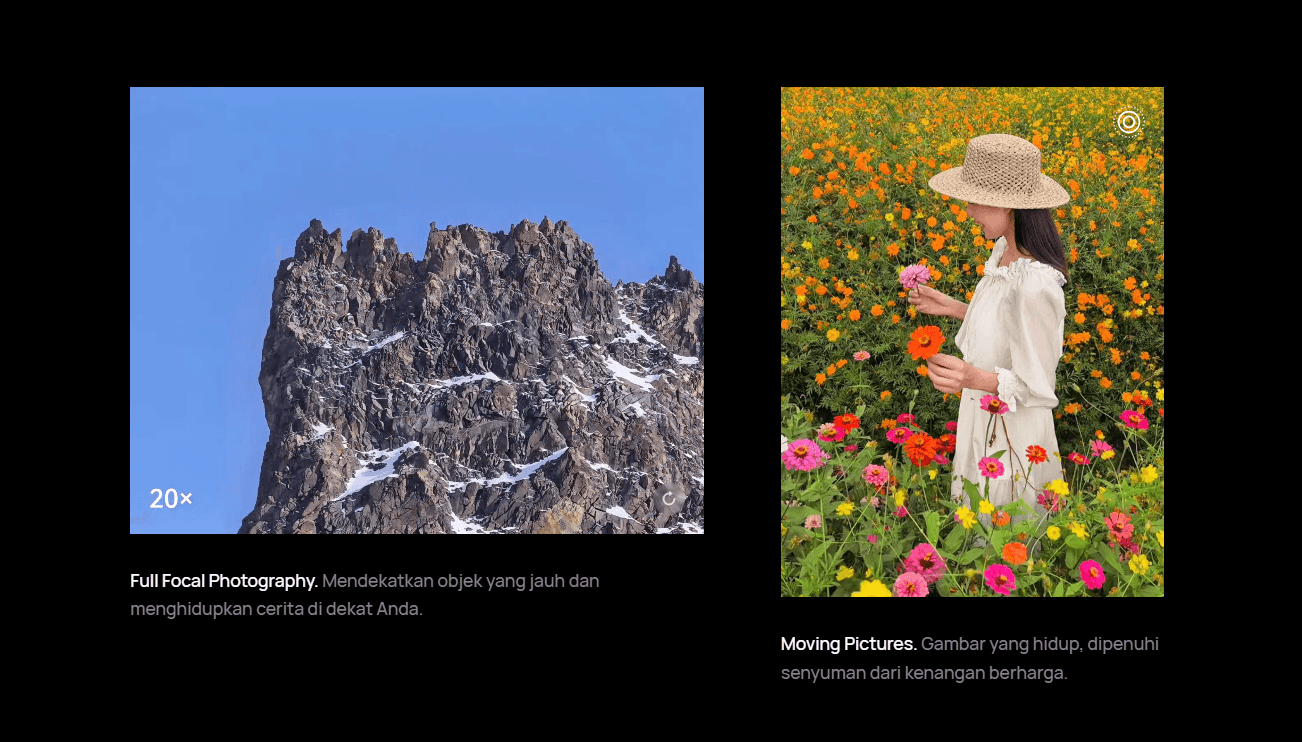 - 48 MP Ultra Lighting Macro Telephoto Camera dengan aperture F2.1 dan OIS. Kamera ini sempurna untuk close-up objek kecil dengan ketajaman tinggi.