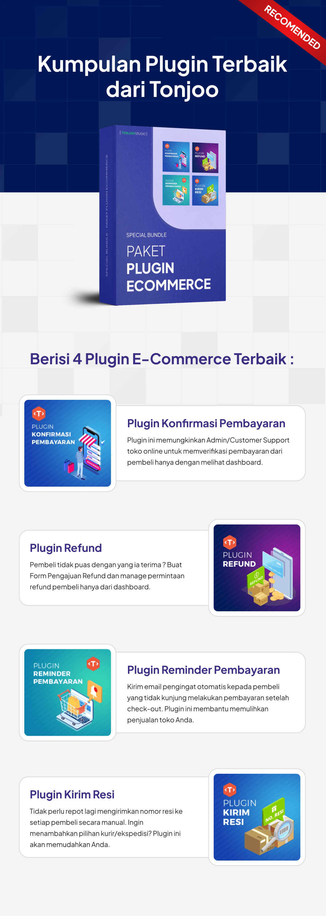 Pembeli tidak suka proses berbelanja online yang merepotkan. Buat mereka nyaman berbelanja di Toko Online Anda dengan Paket Plugin E-Commerce Tonjoo. Tonjoo menyediakan Special Bundle Paket Plugin E-Commerce lengkap dengan biaya lebih hemat.